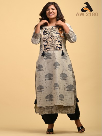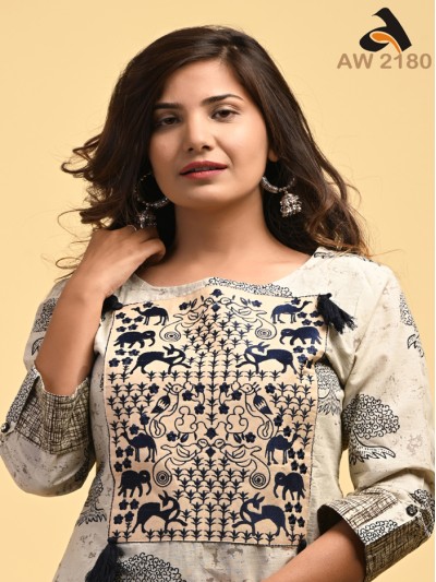 Premium quality cotton front side double layered straight kurta with abstract print on inner layer and distinctive tree print on outer layer with very fine embroidered animal figures on yoke with thread drops on all 4 sides of yoke.