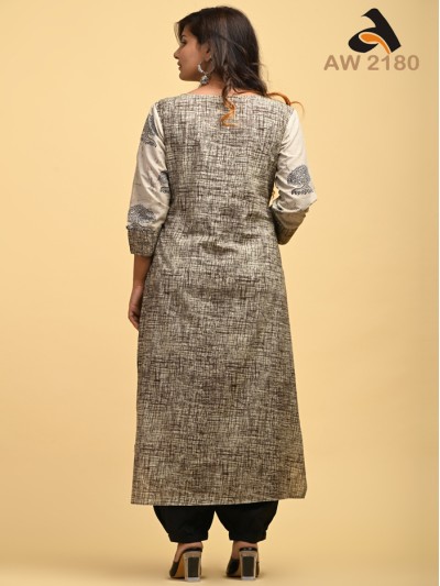Premium quality cotton front side double layered straight kurta with abstract print on inner layer and distinctive tree print on outer layer with very fine embroidered animal figures on yoke with thread drops on all 4 sides of yoke...