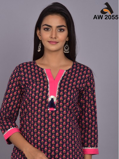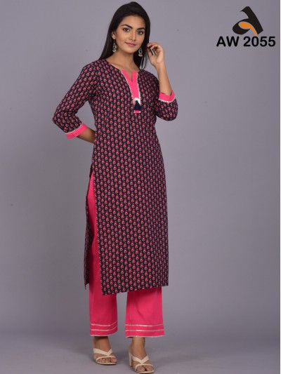 Premium quality Cotton kurta and pant set in beautiful ethnic Small booti print kurta with contrast placket highlighted with gota lace & flower. Sleeves also with contrast pink trims and gota laces. Pant in matching solid pink color with gota laces at bottom with one side pocket.