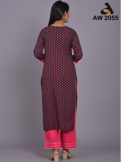 Premium cotton handblock kurta & palazzo set with a beautiful double layer kurta inspired with mughal attire with a glass yoke pattern neck with pintex work following & buttons with loops.