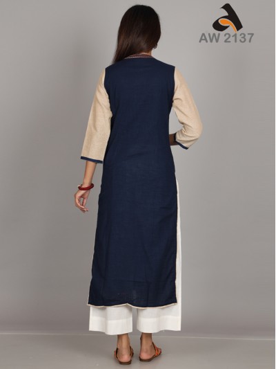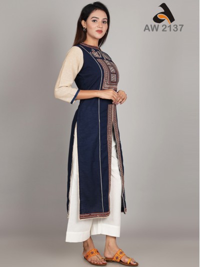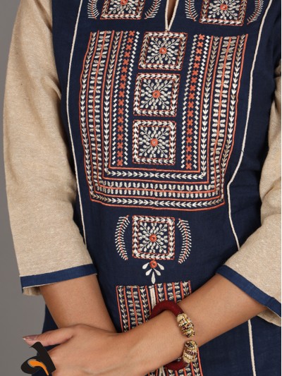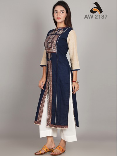 Premium cotton A line kurta in machine Katha fabric with front two pockets.