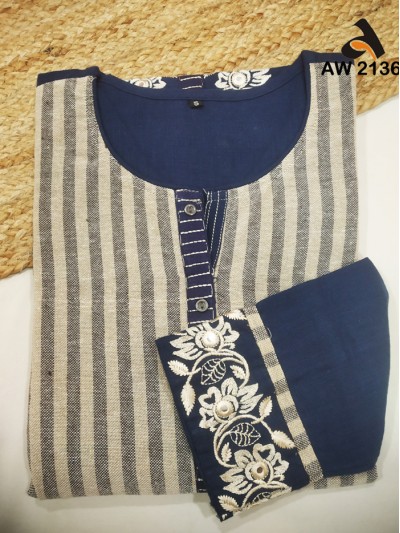 Premium cotton slub kurta with front jute fabric yoke in stripes. Heavy embroidery in bottom and sleeves. Detailing on sleeves and kurta hem with jute fabric patti.